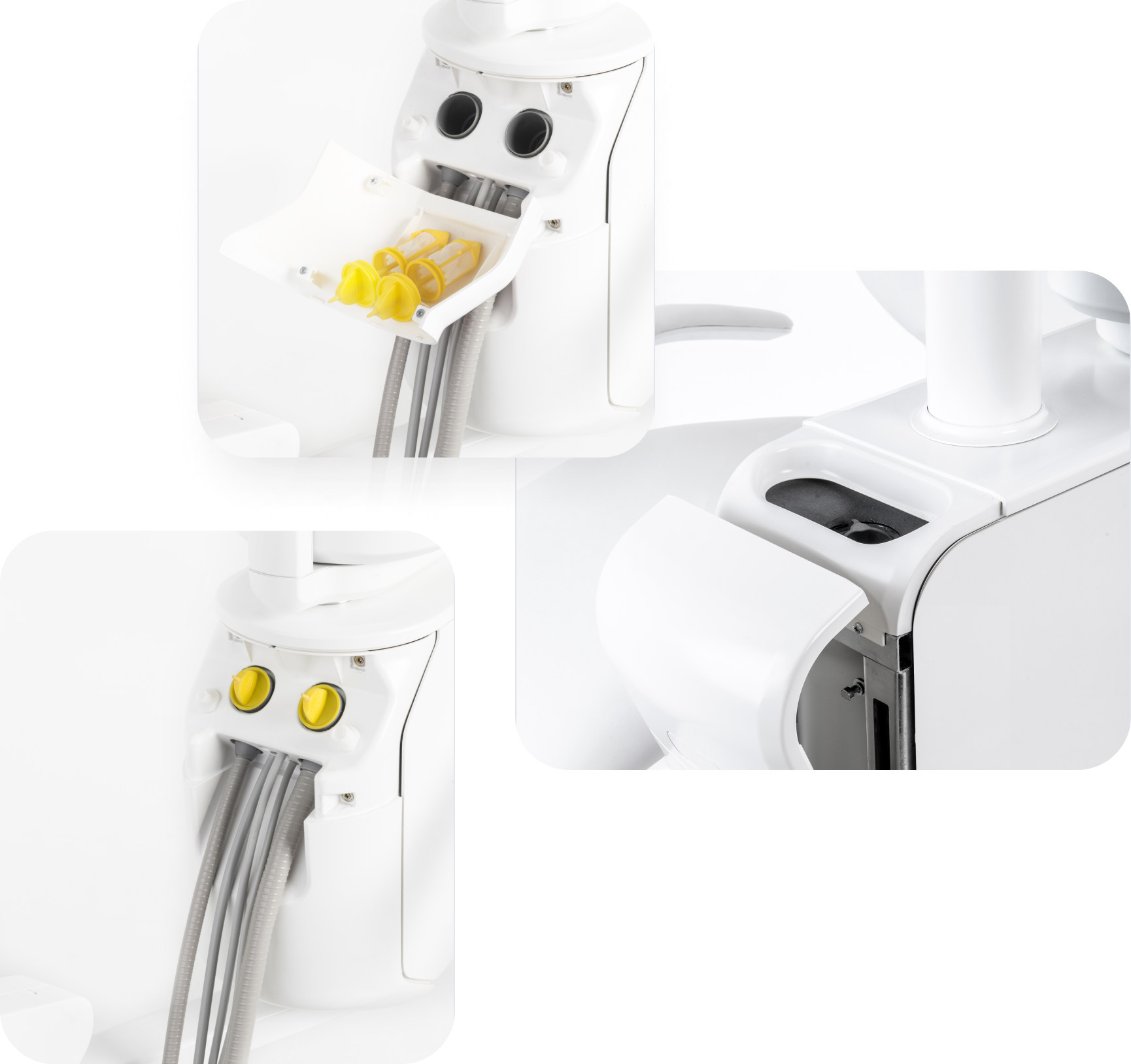 Egal ob Sie die obere oder untere Schlauchabgabe wählen, durch das Design des Zahnarzttisches wird Ihnen ein intuitives Arbeiten, mit allen Instrumenten in Reichweite Ihrer Hand ermöglicht.
